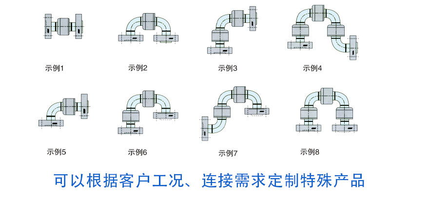 将旋转管接头与弯管或拐角构件合起来,就可组成不同结构式样的挠性管 路。