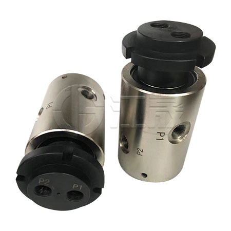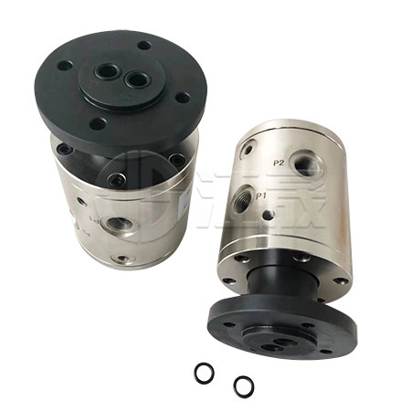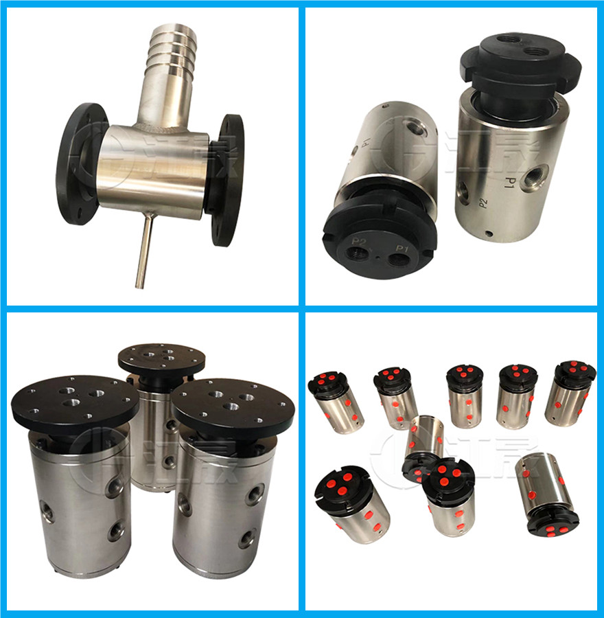 液压多通路旋转接头用于液压系统多个管路的供油润滑。进油端分为侧面进入,后端进入。根据客户的安装位置决定。公司可定制2-16通路的旋转接头。
