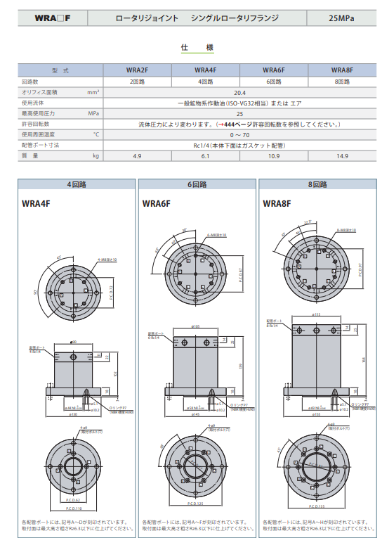 KRA 型号的旋转接头利用旋转轴的贯通孔对冷却 液等进行配管的中心通孔型。单转盘法兰盘型的 本体安装部呈法兰盘形状,降低了整体高度,结 构紧凑。有从 2 回路到 8 回路四种类型可供选择, 各回路可独立使用。请通过座垫式配管从本体法 兰盘侧供油。