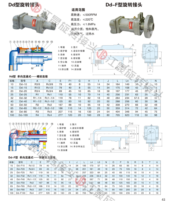 D型旋转接头是专门适用于热水专用的系列产品。采用了波纹补偿器和浮动密封环作动密封的主要形式,
