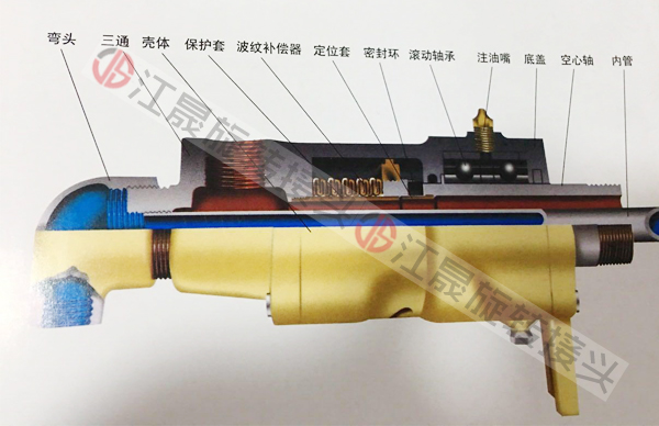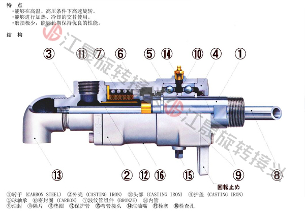 采用双端面密封,结构较复杂。滚动轴承使磨擦扭矩相对减小,不锈钢波纹管补偿器使旋转接头更耐腐