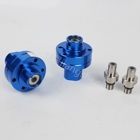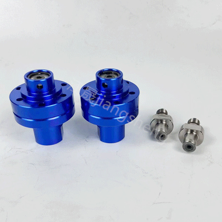 此款接头专用于当今高技术自动线中的超高速主轴。该新一代接头的速度能够超过金属滚珠轴承速度范围,采用外部支撑,完全不需要用内装轴承支撑。转体短轴直接安装在主轴端,而主体则刚性地安装在固定表面并目与转体精确对中。实际上,接头此时已经成为主轴部件中一个无振动的整体件。由于采用无轴承设计结构及相当抗磨损的碳化硅密封,使接头能够达到低扭矩平稳运行,从而实现更长久无故喧使用寿命。另一个特点是结构紧凑,可以很方便地根据原有设备进行设计。