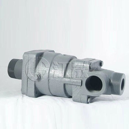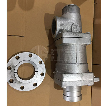 D型热水高温旋转接头采用双端面 密封,结构较复杂。滚动轴承使磨擦扭矩相对减小,不锈钢波纹管补偿器使旋转接头更耐腐 蚀,且弹簧外装不与介质接触使密封更可靠。与设备相连的 外管是主要的旋转部件。平面密封环靠定位套定位浮动在外 管、补偿器间并组成双端面密封磨擦副;弹簧随时提供密封所需的端面压力。为了便于观察密封环磨损及密封状况,在壳体上设有观察孔。在高温时轴承应请注意 定期润滑。