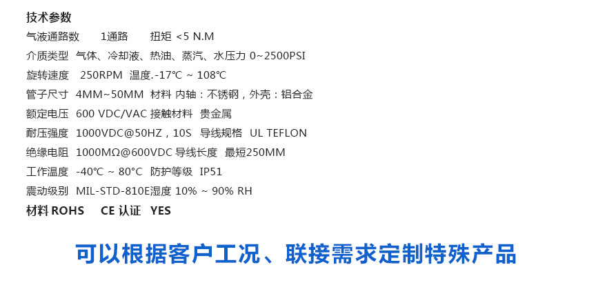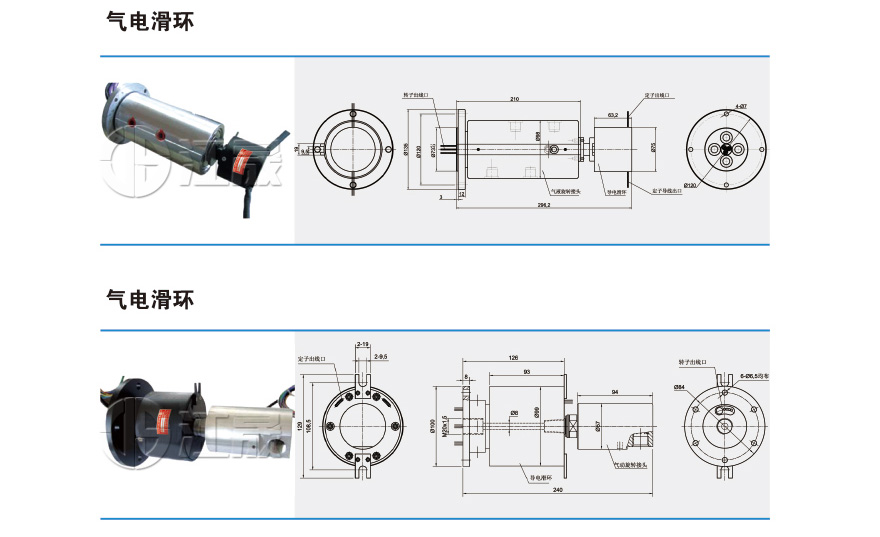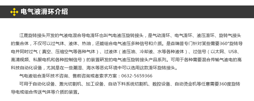 气液电混合导电滑环也叫气电液压旋转接头,是气动滑环、电气滑环、液压滑环、旋转气接头的集合体,不仅可以过气体、液体、热油,还能组合电气液压多种信号和介质。