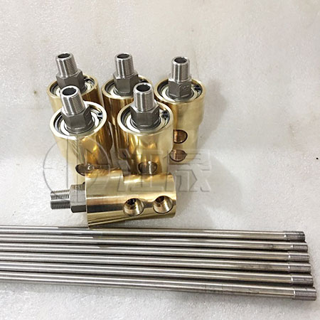 H型旋转接头又称冷却水 旋转接头,是专门为适用于冷却方面设计的系列产品,它具有体积小、重量轻、摩擦扭距小等 特点,采用了平面密封技术,摩擦组对材料根据介质环境,选择各种浸渍石墨、青铜、碳化钨、氮化硅 的不同组对,足以抵挡铁锈、结垢、碎屑等杂质对密封面的影响,我们的密封件是在CNC机床和专用研磨 机上完成的、表面如同镜面,使密封更加可靠,同时还采用高精度滚动轴承,使其平稳旋转。